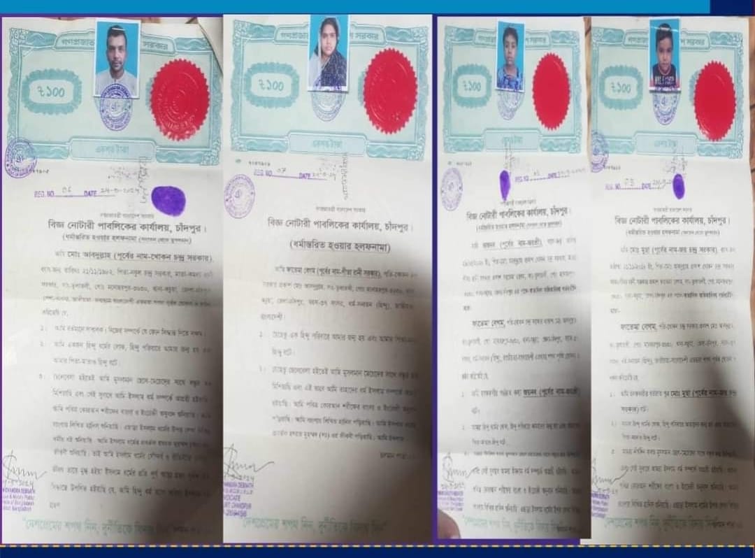 বিশেষ প্রতিনিধি:: চাঁদপুর জেলার কচুয়া উপজেলার শিশু ছেলে-মেয়ে সহ এক দম্পতি হিন্দু থেকে ধর্মান্তরিত হয়ে ইসলাম ধর্ম গ্রহণ করেছেন। ২৪ সেপ্টেম্বর মঙ্গলবার চাঁদপুর নোটারি পাবলিকের কার্যালয় থেকে নিবন্ধন সম্পন্ন করে ইমামে রাব্বানী দরবার শরীফের পীর সৈয়দ বাহাদুর শাহ মোজাদ্দেদীর কাছে রাত আনুমানিক ৮ টার দিকে কালিমা পড়েন তারা। এ সময় সহকারি অধ্যক্ষ আল্লামা মুফতী আবুল হাশেম শাহ্ মিয়াজী উপস্থিত ছিলেন।