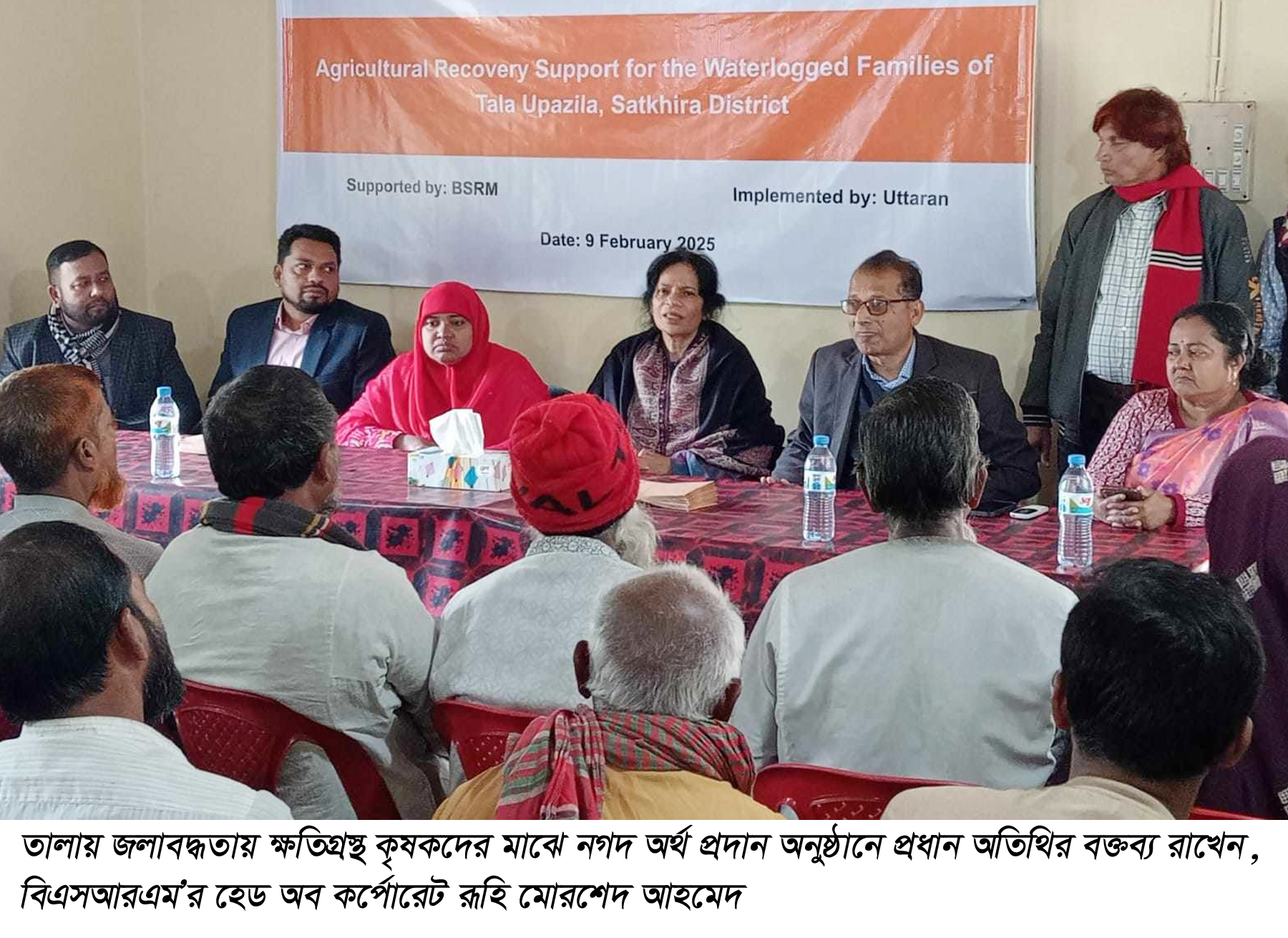 তালায় জলাবদ্ধতায় ক্ষতিগ্রস্থ ৬০ জন কৃষকের মাঝে ৫ হাজার টাকা করে নগদ অর্থ সহায়তা প্রদান করেছে বে-সরকারী সংস্থা উত্তরণ। রোববার (৯ ফেব্রুয়ারি) উত্তরণ জাতপুর কার্যালয়ে জলাবদ্ধ এলাকার কৃষক পরিবারের জন্য “জলাবদ্ধ পরিবারের এগ্রিকালচার রিকোভারি সাপোর্ট প্রজেক্ট” প্রকল্পের আওতায় এবং স্টিল প্রস্তুতকারী প্রতিষ্ঠান “বিএসআরএম”এর অর্থায়নে অর্থ সহায়তা প্রদান অনুষ্ঠানে প্রধান অতিথি হিসাবে উপস্থিত ছিলেন, বিএসআরএম এর হেড অব কর্পোরেট রূহি মোরশেদ আহমেদ।