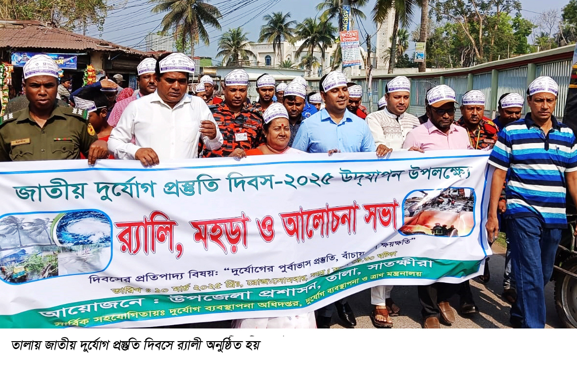 তালা প্রতিনিধি: দুর্যোগের পূর্বাভাস প্রস্তুতি, বাঁচায় প্রাণ ক্ষয়ক্ষতি- প্রতিপাদ্য স্লোগান সামনে রেখে সাতক্ষীরার তালায় জাতীয় দূর্যোগ প্রস্তুতি দিবস-২৫ পালিত হয়েছে। উপজেলা প্রশাসনের আয়োজনে, দূর্যোগ ব্যবস্থাপনা অধিদপ্তরের বাস্তবায়নে এবং উত্তরণ ও ওয়ার্ল্ড কনসার্ন বাংলাদেশ’র সার্বিক সহযোগীতায় দিবসটি পালনে সোমবার (১০ মার্চ) সকালে একাধিক কর্মসূচী অনুষ্ঠিত হয়।