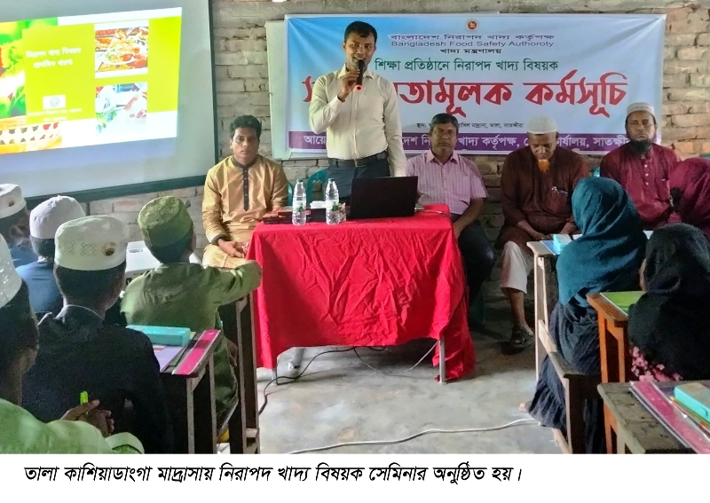 তালা প্রতিনিধি: বাংলাদেশ নিরাপদ খাদ্য কর্তৃপক্ষ সাতক্ষীরা জেলা অফিস কর্তৃক আয়োজিত নিরাপদ খাদ্য বিষয়ক সচেতনতামূলক সেমিনার সোমবার (২৮ জুলাই) দুপুর ১২টায় তালা উপজেলার কাশিয়াডাংগা দাখিল মাদ্রাসায় অনুষ্ঠিত হয়। সেমিনারে সভাপতিত্ব করেন মাদ্রাসার সুপার মাও. মো. আব্দুর রাজ্জাক।