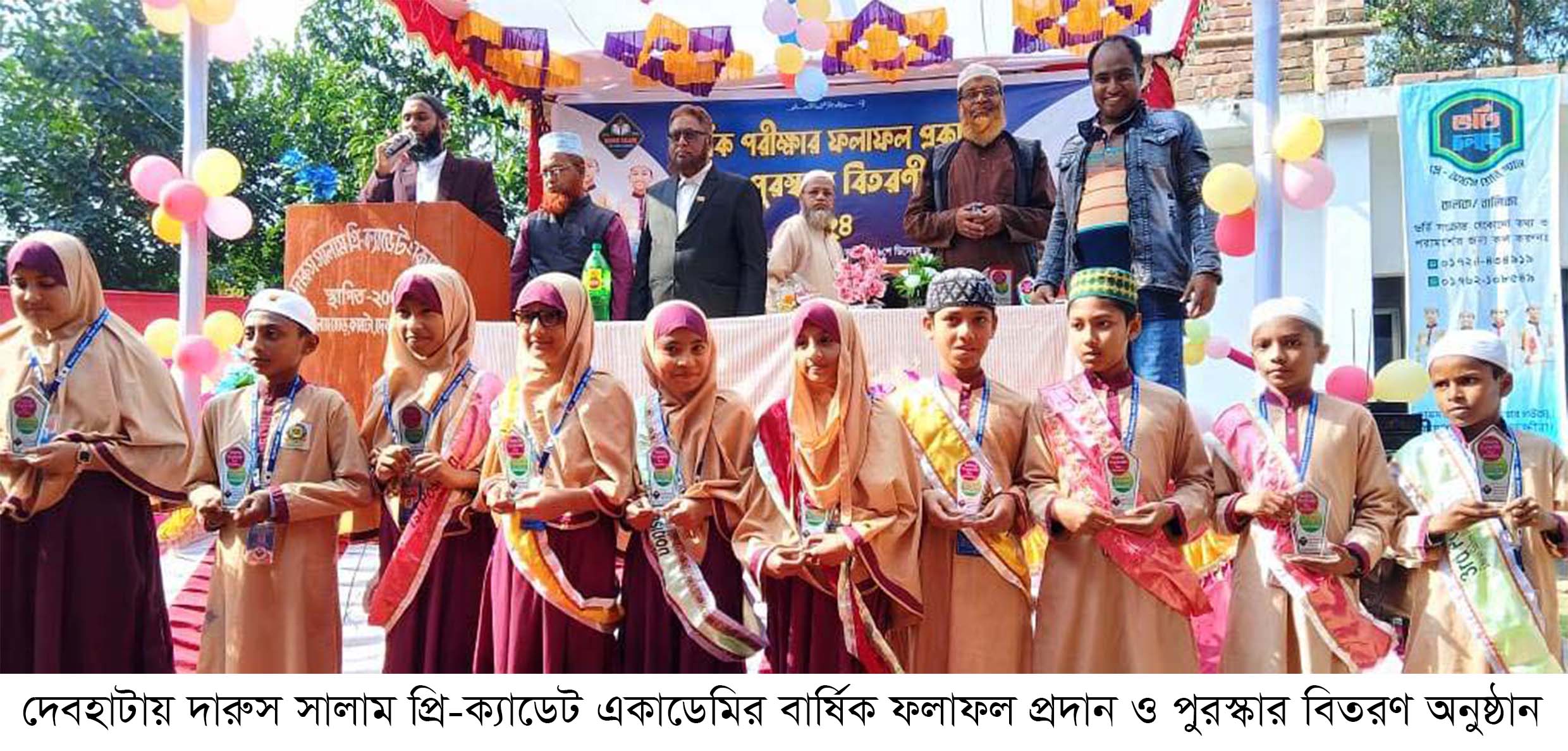 দেবহাটা প্রতিনিধি: দেবহাটার কামটা পাওয়ার হাউজ সংলগ্ন দারুস সালাম প্রি-ক্যাডেট একাডেমির বার্ষিক পরীক্ষার ফল প্রদান করা হয়েছে। রবিবার (২৯ ডিসেম্বর) প্রতিষ্ঠান চত্বরে এ অনুষ্ঠানের আয়োজন করা হয়। এতে প্রতিষ্ঠান পরিচালনা কমিটির সভাপতি আলহাজ্ব মোক্তার হোসেনের সভাপতিত্বে ও প্রিন্সিপাল ইমদাদুল হকের পরিচালনায় প্রধান অতিথি ছিলেন নওয়াপাড়া ইউনিয়নের সাবেক চেয়ারম্যান আলহাজ্ব আব্দুল খালেক। বিশেষ অতিথি ছিলেন ম্যানেজিং কমিটির সাধারণ সম্পাদক আলহাজ্ব আবু হাসান, দাতা সদস্য মাওলানা শহিদুল ইসলাম, হাফেজ রওশন আলী, আব্দুস সোবহান, ইমান আলী, নুর আলী সরদার, সোহরাব আলী সরদার, এহছানুল হক প্রমুখ। বক্তব্য দেন দেবহাটা প্রেসক্লাবের সভাপতি মীর খায়রুল আলম, নওয়াপাড়া ইউনিয়ন জামায়াতের আমীর মাহাবুব আলম, সাতক্ষীরা জেলা ক্রীড়া সংস্থার বিশিষ্ট ভাষ্যকর সিরাজুল ইসলাম, স্থানীয় ইউপি সদস্য ফরিদা পারভীন, প্রতিষ্ঠানের ভাইস প্রিন্সিপাল আজগর আলী, শিক্ষক সাব্বির আহম্মেদ প্রমুখ। বক্তারা বলেন, প্রতিষ্ঠানটি ২০০৮ সাল থেকে শিশুদের জেনারেল কারিকুলামের সাথে বাংলা, আরবি, ইংরেজি ভাষায় দক্ষতা অর্জনে শিক্ষা প্রদান করে যাচ্ছে। প্রান্তিক পর্যায়ে আধুনিক মানের শিক্ষা প্রদানে বিশেষ ভূমিকা রাখায় শিক্ষকদের ধন্যবাদ জানান বক্তারা। পরে প্লে থেকে কেজি ৭ম শ্রেণির ফলাফল ঘোষণা করা হয়। বিভিন্ন ক্লাসে ১,২,৩ রোল অর্জনকারী, হেফজ বিভাগ ও বিভিন্ন ক্যাটাগরিতে শিক্ষার্থী, অভিভাবক, দাতা এবং শিক্ষক-স্টাফদের পুরস্কার প্রদান করা হয়। এছাড়া জাতীয় শিক্ষা সপ্তাহ ও বিভিন্ন পর্যায়ে সাফল্য অর্জনকারী শিক্ষার্থীদের বিশেষ পুরস্কারে ভূষিত করা হয়।