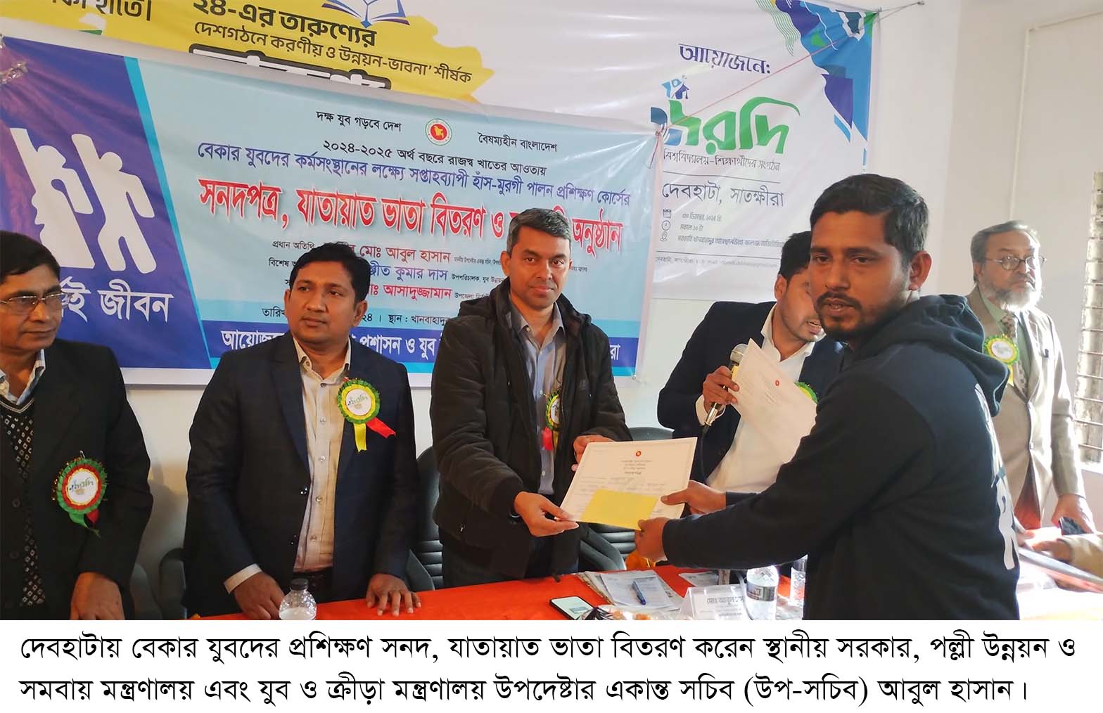 দেবহাটা প্রতিবেদক: বেকার যুবদের কর্মসংস্থানের লক্ষ্যে সপ্তাহব্যাপী হাঁস-মুরগী পালন প্রশিক্ষণ কোর্সের সনদপত্র, যাতায়াত ভাতা বিতরণ করা হয়েছে। সোমবার (৩০ ডিসেম্বর) সরকারি খান বাহাদুর আহছান উল্লা কলেজের আইসিটি হলরুমে এ অনুষ্ঠান অনুষ্ঠিত হয়। অনুষ্ঠানে উপজেলা নির্বাহী অফিসার মো. আসাদুজ্জামানের সভাপতিত্বে প্রধান অতিথি ছিলেন স্থানীয় সরকার, পল্লী উন্নয়ন ও সমবায় মন্ত্রণালয় এবং যুব ও ক্রীড়া মন্ত্রণালয় উপদেষ্টার একান্ত সচিব (উপ-সচিব) উপদেষ্টা মো. আবুল হাসান। উপস্থিত ছিলেন জেলা যুব উন্নয়ন অধিদপ্তরের উপ-পরিচালক সন্দীপ কুমার দাস, সরকারি খানবাহাদুর আহছানউল্লা কলেজের অধ্যক্ষ প্রফেসর অলোক কুমার ব্যানার্জী, দেবহাটা থানার অফিসার ইনচার্জ হযরত আলী, উপজেলা যুব উন্নয়ন কর্মকর্তা আহমেদ তাহমীর সিদ্দিকী, সরকারি খানবাহাদুর আহছানউল্লা কলেজের অবসরপ্রাপ্ত অধ্যক্ষ রিয়াজুল ইসলাম, দেবহাটা প্রেসক্লাবের সভাপতি মীর খায়রুল আলম, উপজেলা একাডেমিক সুপারভাইজার মিজানুর রহমান সহ বিভিন্ন পর্যয়ের ব্যক্তিবর্গ ও যুব সদস্যরা।
