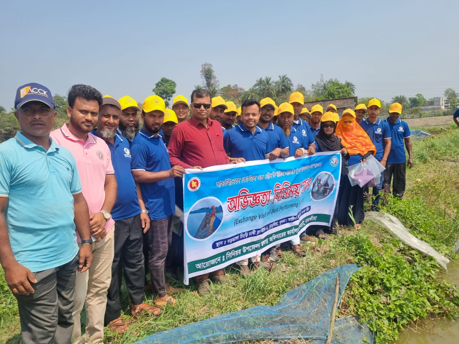 চাষিরা তাদের অভিজ্ঞতা বিনিময়ের জন্য ডুমুরিয়া উপজেলার বড়ডাঙ্গা চিংড়ি চাষি ক্লাস্টার-২ পরিদর্শন করেন। অভিজ্ঞতা বিনিময় সফরে উভয় ক্লাস্টারের চাষীদের মধ্যে বিভিন্ন তথ্য-উপাত্ত নিয়ে ব্যাপক আলোচনা ও প্রশ্নোত্তর পর্ব অনুষ্ঠিত হয়। এ সময় গত বছর স্বর্ণ পদক প্রাপ্ত চাষি মো: তবিবুর রহমান জোয়াদ্দারসহ আধা নিবিড় চিংড়ি চাষি নিত্যানন্দ মন্ডল, অভিজিৎ বিশ্বাস ও সফল ক্লাস্টার লিডার শেখ মাহতাব হোসেন বক্তব্য রাখেন। বড়ডাঙ্গা চিংড়ি চাষি ক্লাস্টার-২ এর চাষিগন তাদের ক্লাস্টারের আয়-ব্যয় ও ব্যবসায়িক পরিকল্পনা তুলে ধরেন। আলোচনা শেষে চাষীরা সরেজমিনে চিংড়ির বৃদ্ধি ও উৎপাদন দেখার জন্য চাষির ঘের সরেজমিনে পরিদর্শন করেন। এ সময় ঘেরের মালিক অনুপ মন্ডল জাল টেনে মাছ দেখান। উপস্থিত সকলে চিংড়ি ও মাছ দেখে সন্তুষ্টি প্রকাশ করেন। এ সময় প্রধান অতিথি হিসেবে উপস্থিত ছিলেন সাতক্ষীরা জেলার জেলা মৎস্য অফিসার জি. এম. সেলিম। তিনি বলেন বড়ডাঙ্গা মডেল অন্যান্য এলাকায় অনুসরন করলে চাষিরা উৎপাদন ২ থেকে ৩ গুন বাড়াতে পারবেন।
