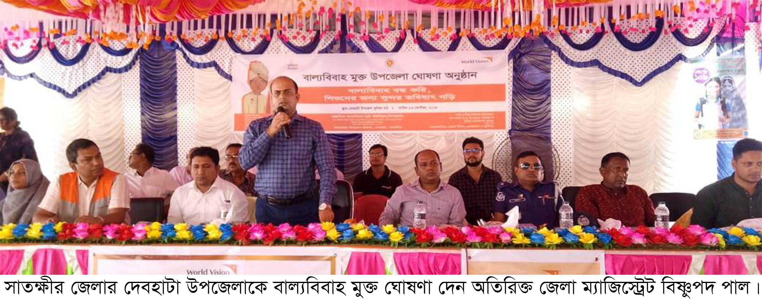 দেবহাটা প্রতিনিধি: “বাল্য বিবাহ বন্ধ করি, শিশুদের জন্য সুন্দর ভবিষ্যৎ, গড়ি এই স্লোগানকে সামনে রেখে দেবহাটা উপজেলাকে বাল্যবিবাহ মুক্ত ঘোষণা করা হয়েছে। সোমবার (২৩ সেপ্টেম্বর) ওয়ার্ল্ড ভিশন বাংলাদেশ এর অর্থায়নে, দেবহাটা এরিয়া প্রোগ্রাম ও সুশীলনের আয়োজনে দেবহাটা ফুটবল মাঠে এ ঘোষণা অনুষ্ঠান অনুষ্ঠিত হয়। অনুষ্ঠানে দেবহাটা উপজেলা নির্বাহী কর্মকর্তা মো. আসাদুজ্জামানের সভাপতিত্বে প্রধান অতিথি ছিলেন অতিরিক্ত জেলা ম্যাজিস্ট্রেট বিষ্ণুপদ পাল।