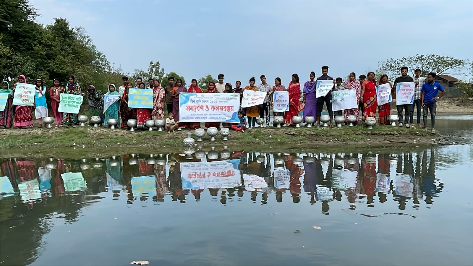 এসময় স্থানীয় শতাধিক গৃহিণীরা পানির কলস নিয়ে নদীর তীরে অবস্থান নেন। কলসবন্ধনে তাঁরা “টাকা দিয়ে পানি কিনে খেতে চাই না”, পানি বাণিজ্যিকরন বন্ধ করো “আর কতকাল লবণ পানি খেতে হবে?” সহ বিভিন্ন ¯ প্রতিবাদ সম্বলিত ব্যানার ফেস্টুন হাতে নিয়ে নিজেদের দাবীগুলো তুলে ধরেন।