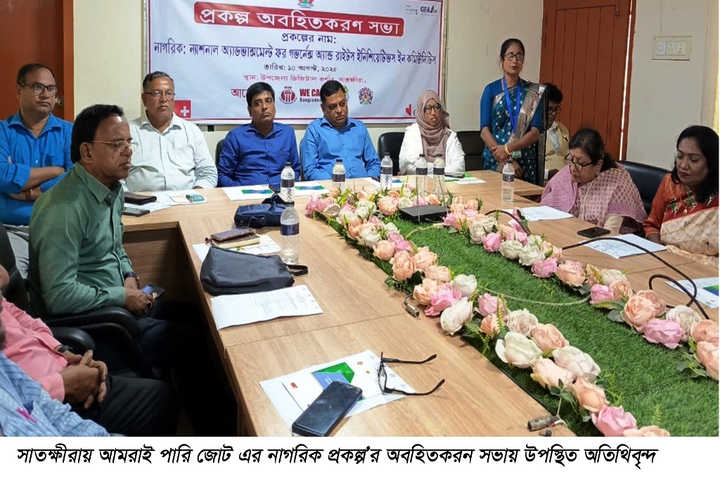 নাগরিক প্রকল্প বাস্তবায়নপূর্ব প্রকল্প অবহিতকরণ সভা রোববার (১০ আগষ্ট) সকালে সাতক্ষীরা সদর উপজেলা ডিজিটাল কর্ণার’র সেমিনার কক্ষে অনুষ্ঠিত হয়েছে। এ এ্যাম্ভাসি অফ সুইজারল্যান্ড ও গ্লোবাল এ্যাফেয়ার্স কানাডার অর্থায়নে, মানুষের জন্য ফাউন্ডেশন এর সহযোগীতায় অনুষ্ঠিত সভায় সভাপতিত্ব করেন, উদ্দীপ্ত মহিলা উন্নয়ন সংস্থার নির্বাহী পরিচালক জয়ন্তী রানী মন্ডল। এসময় প্রধান অতিথি হিসাবে উপস্থিত ছিলেন, সাতক্ষীরা যুব উন্নয়ন অধিদপ্তরের উপ-পরিচালক সঞ্জীত কুমার দাস। বেসরকারি সংস্থা নকশিকাথা’র পরিচালক চন্দ্রীকা ব্যানার্জী’র পরিচালনায় বিশেষ অতিথি হিসাবে উপস্থিত ছিলেন, জেলা মহিলা বিষয়ক অধিদপ্তরের প্রোগ্রাম অফিসার ফাতেমা জোহরা ও ওসিসি আব্দুল হাই সিদ্দিক।
