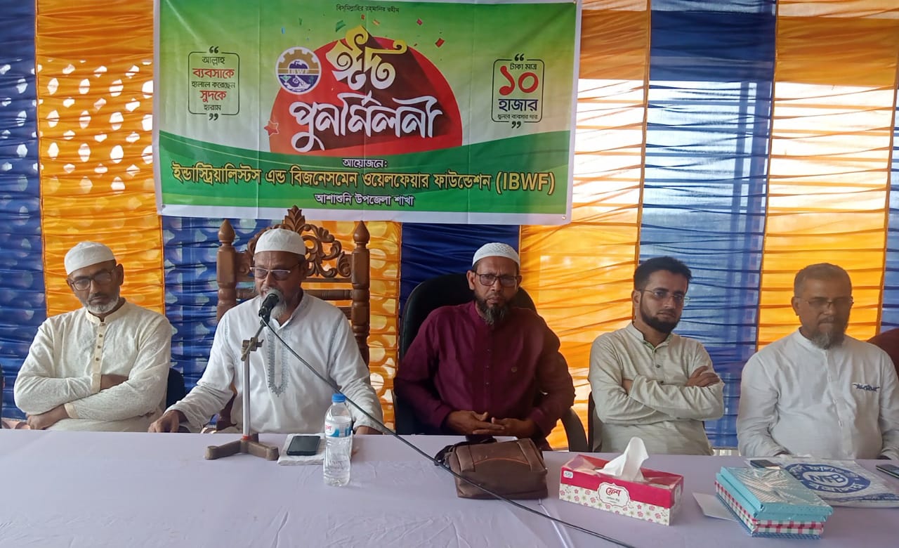 আশাশুনি(সাতক্ষীরা)সংবাদদাতা: আল্লাহ্ তায়ালা ব্যবসাকে হালাল করেছেন,সুদকে হারাম করেছেন। টাকা মাত্র ১০ হাজার খুলবে ব্যবসার দার এই শ্লোগানকে সামনে রেখে আশাশুনিতে ব্যবসায়ী সংগঠন”ইন্ডাস্ট্রিয়ালিস্টস এন্ড বিজনেসমেন ওয়েলফেয়ার ফাউন্ডেশন (IBWF)”এর আয়োজনে ঈদ পুনর্মিলনী অনুষ্ঠিত হয়েছে। শুক্রবার বেলা ১১টায় আশাশুনি উপজেলা মুক্তিযোদ্ধা কমপ্লেক্স ভবনে আশাশুনি উপজেলা শাখা এ অনুষ্ঠানের আয়োজন করে। উপজেলা সভাপতি এবিএম আলমগীর পিন্টুর সভাপতিত্বে ও সেক্রেটারী আবুল খায়ের’র সঞ্চালনায় অনুষ্ঠানে প্রধান অতিথির বক্তব্য রাখেন খুলনা জোনাল সভাপতি খান মোশারফ হোসেন। বিশেষ অতিথির বক্তব্য রাখেন সাতক্ষীরা জেলা সভাপতি মহিউদ্দিন মাহমুদ,সেক্রেটারী কামাল হোসেন,জেলা উপদেষ্টা এ্যাড.আব্দুস সোবহান মুকুল,উপজেলা উপদেষ্ঠা মাওঃ নুরুল আবছার মুরতাজা,উপজেলা পেশাজীবি সংগঠনের সভাপতি মাওঃ আতাউর রহমান,আই বি ডাব্লু এফ এর উপজেলা সহ সেক্রেটারী
