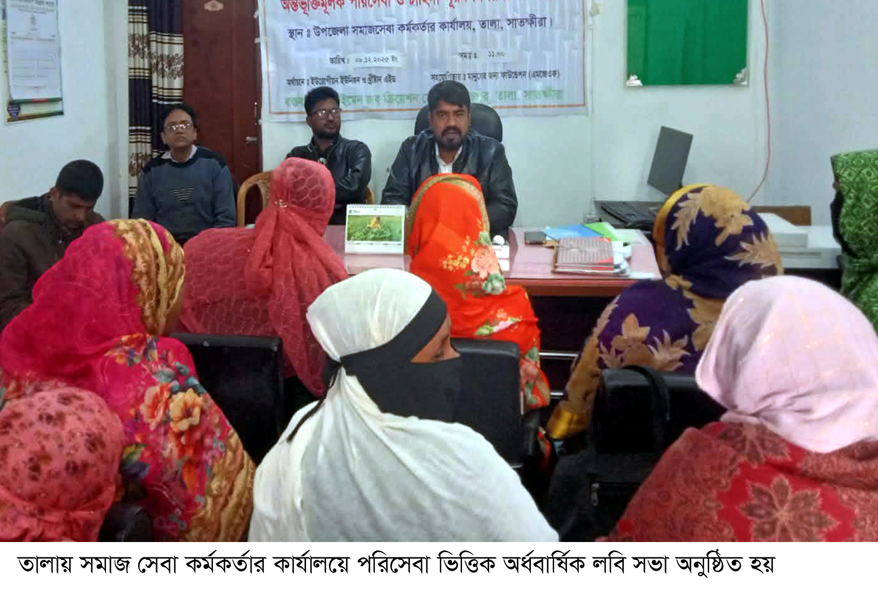 তালা প্রতিনিধি: সোমবার (৮ ডিসেম্বর) সকালে তালা উপজেলা সমাজ সেবা কর্মকর্তার কার্যালয়ে পরিসেবা ভিত্তিক অর্ধবার্ষিক লবি সভা অনুষ্ঠিত হয়। ইউরোপিয়ান ইউনিয়ন ও খ্রীষ্টান এইডের অর্থায়নে এবং মানুষের জন্য ফাউন্ডেশনের সহযোগিতায় ও উইমেন জব ক্রিয়েশন সেন্টারের বাস্তবায়নে অনুষ্ঠিত সভায় সভাপতিত্ব করেন উপজেলা সমাজসেবা কর্মকর্তা শরিফুল ইসলাম। সভায় মডারেটরের দায়িত্ব পালন করেন প্রকল্প সমন্বয়কারী কাজী বাবর আলী। সহযোগীয় ছিলেন সংশ্লিষ্ট ইউনিয়নের ফিল্ড ভলেন্টিয়ার তানজিলা খাতুন ও প্রশান্ত কুমার ঘোষ। উক্ত লবি সভায় জালালপুর ও মাগুরা ইউনিয়নের ১৫ জন নারীদলের সদস্য এবং সংশ্লিষ্ট কর্মকর্তাগণসহ ৩০ জন অংশগ্রহণ করেন।