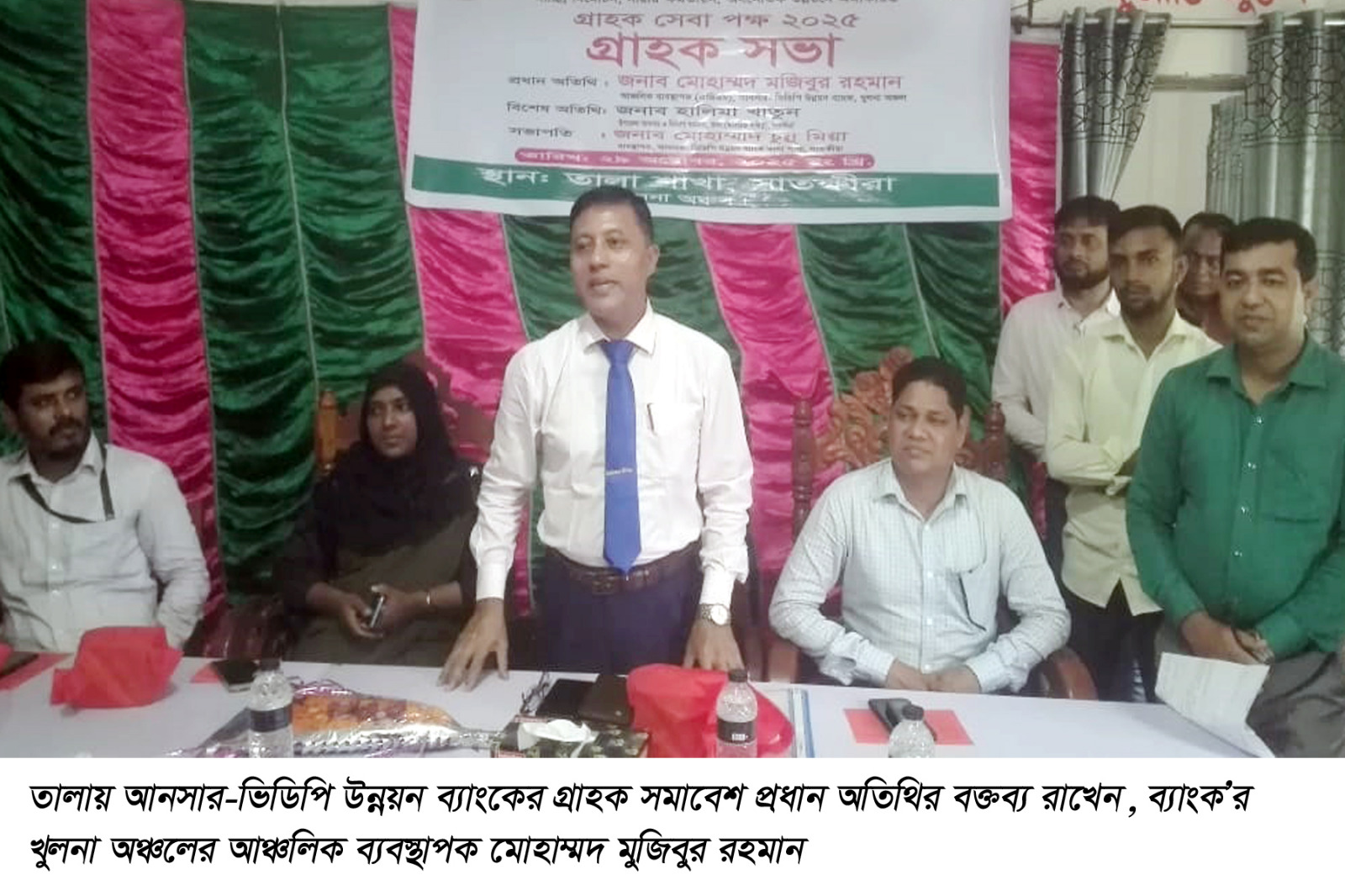 আনসার-ভিডিপি উন্নয়ন ব্যাংক তালা শাখার ব্যবস্থাপক মোহাম্মদ চুন্নু মিয়া’র সভাপতিত্বে বিশেষ অতিথির বক্তব্য রাখেন, তালা উপজেলা আনসার ও ভিডিপি কর্মকর্তা হালিমা খাতুন ও খুলনা আঞ্চলিক কার্যালয়ের অফিসার আলমগীর হোসেন। তালার শাখার অফিসার নাজমুল হক’র সঞ্চালনায় এসময় অন্যান্যের মধ্যে তালা শাখার অফিসার জাহেদুল ইসলাম, বিশিষ্ট ব্যবসায়ী মিজানুর রহমান, সাংবাদিক জুলফিকার রায়হান, গ্রাহক শাহিনুর রহমান প্রমুখ বক্তব্য রাখেন।