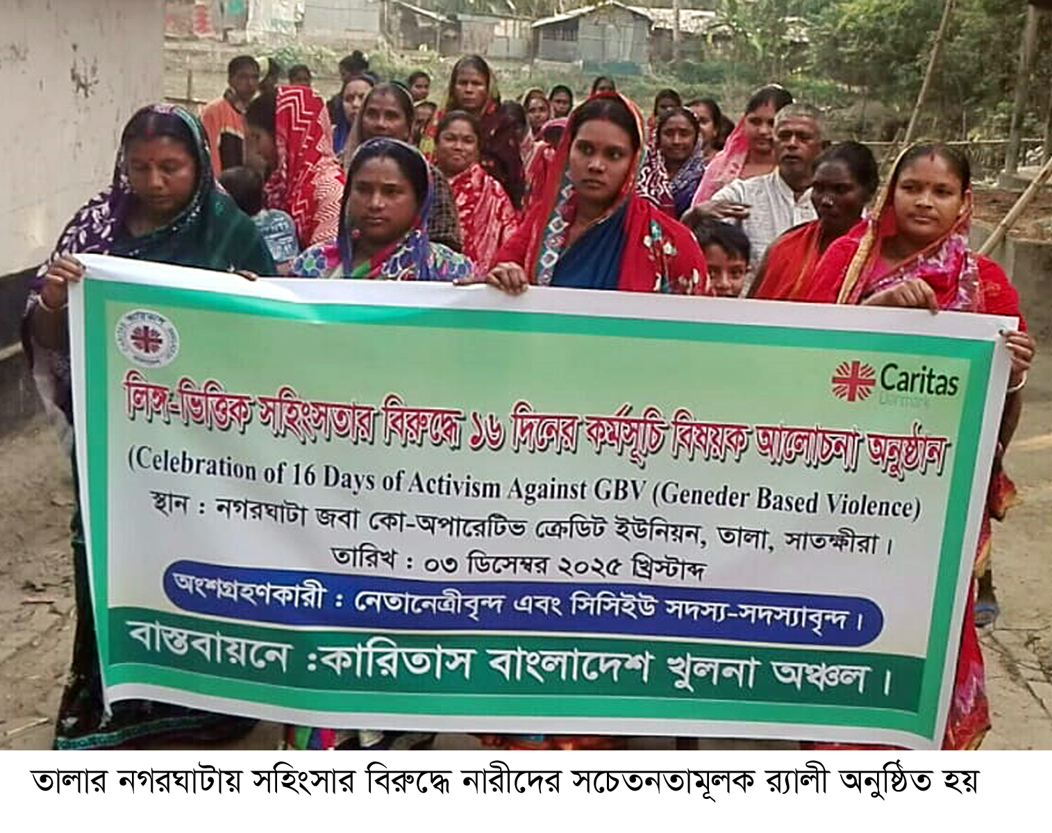 তালা প্রতিনিধি: সব নারী ও কন্যার প্রতি ডিজিটাল সহিংসতা বন্ধে ঐক্যবদ্ধ হোন- প্রতিপাদ্য বিষয় সামনে নিয়ে ২৫ নভেম্বর থেকে ১০ ডিসেম্বর পর্যন্ত ১৬ দিন পর্যন্ত লিঙ্গ ভিত্তিক সহিংসতা বিরোধী কর্মসূচী বাস্তবায়ন করছে বেসরকারি সংস্থা কারিতাস। কর্মসূচীর ধারাবাহিকতায় কারিতাস আইডিপিডিসি প্রকল্প’র আওতায় তালা উপজেলার নগরঘাটা ইউনিয়নের নগরঘাটা জবা ক্রেডিট ইউনিয়নের সহযোগীতায় স্থানীয় দাস পাড়ায় গত ৩ ডিসম্বের বিকালে র্যালী ও আলোচনা সভা অনুষ্ঠিত হয়। উক্ত সভায় সভাপতিত্ব করেন কারিতাস’র কমিউনিটি ডেভেলপমেন্ট অফিসার সুকুমার দাস। প্রধান অতিথি হিসেবে ছিলেন তালা রিপোর্টাস ক্লাবের সাবেক সাধারণ সম্পাদক ও উপজেলা দুর্নীতি প্রতিরোধ কমিটির সহ-সভাপতি বি.এম জুলফিকার রায়হান। সভায় বক্তব্য রাখেন কমিউনিটি নারী প্রতিনিধি বিল্লু দাস, মুনমুন দাস, রিংকী দাস এবং সিডিএ কমলেশ মিস্ত্রি প্রমূখ। সমগ্র অনুষ্ঠানটি সঞ্চালনা করেন কারিতাস’র সিডিএ লিটন সেন। জবা ক্রেডিট ইউনিয়নের নেত্রীবৃন্দ উপস্থিত ছিলেন। সভায়- ডিজিটাল প্রযুক্তির মাধ্যমে নারীদের উপর সৃষ্ট অনলাইন-অফলাইন সহিংসতার ঝুঁকি বিষয়ে আলোচনা হয়। একই সাথে নারীদের অধিকার নিশ্চিত করা, বাল্য বিবাহ প্রতিরোধসহ সকল ধরণের সহিংসতা রোধের উপর আলোচনা হয়।