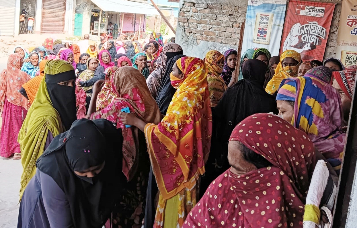 লাইনে দাড়ানো বৃদ্ধা ছবিরোন বিবি জানান, তিনি ভোর ৬টার সময়ে এখানে এসেছেন। বেলা বাড়ার সাথে সাথে তাঁর মতো আরও শত শত নারী এখানে এসেছে আটা কিনতে। শৃঙ্খলা বজায় রাখেতে ডিলারের কর্মীরা নারীদের লাইনে দাড়িয়ে দিয়েছেন। ছবিরোন বিবিসহ এঁদের মধ্যে অনেকেই ৩/৪ ঘন্টা অপেক্ষা করে ১ঘন্টার বেশি সময় লাইনে দাড়িয়েছেন। সেখানে থাকা আলেয়া বেগম বলেন, তিনি খানপুর থেকে ২০ টাকা ভ্যান ভাড়া দিয়ে এসে লাইনে দাড়িয়েছেন। লাইন থেকে সরে গেলে সে আজ আটা নাও পেতে পারে, একারনে রোদে-গরমে কষ্ট হলেও লাইন ভাংছেন না। এনাদের মতো লাইনে দাড়ানো সকলেই একই অবস্থার শিকার।
