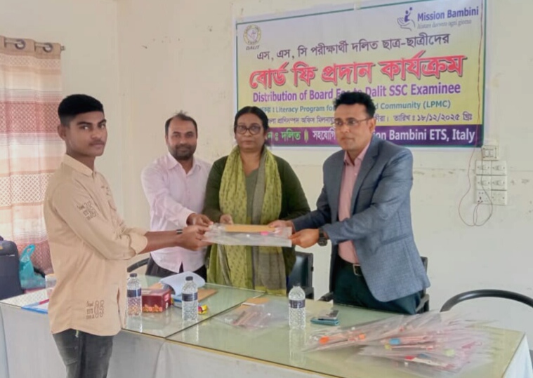 বি. এম. জুলফিকার রায়হান : তালা উপজেলার পিছিয়ে পড়া দলিত জনগোষ্ঠীর ২৪জন মেধাবী শিক্ষার্থীকে এসএসসি পরীক্ষার বোর্ড ফি’র টাকা প্রদান করা হয়েছে। দাতা সংস্থা মিশন বাম্বেনী- ইতালী’র সহযোগীতায়, বেসরকারি সংস্থা দলিত’র উদ্যোগে এবং লেটারেসী প্রকল্পের আওতায় এই অর্থ প্রদান করা হয়।