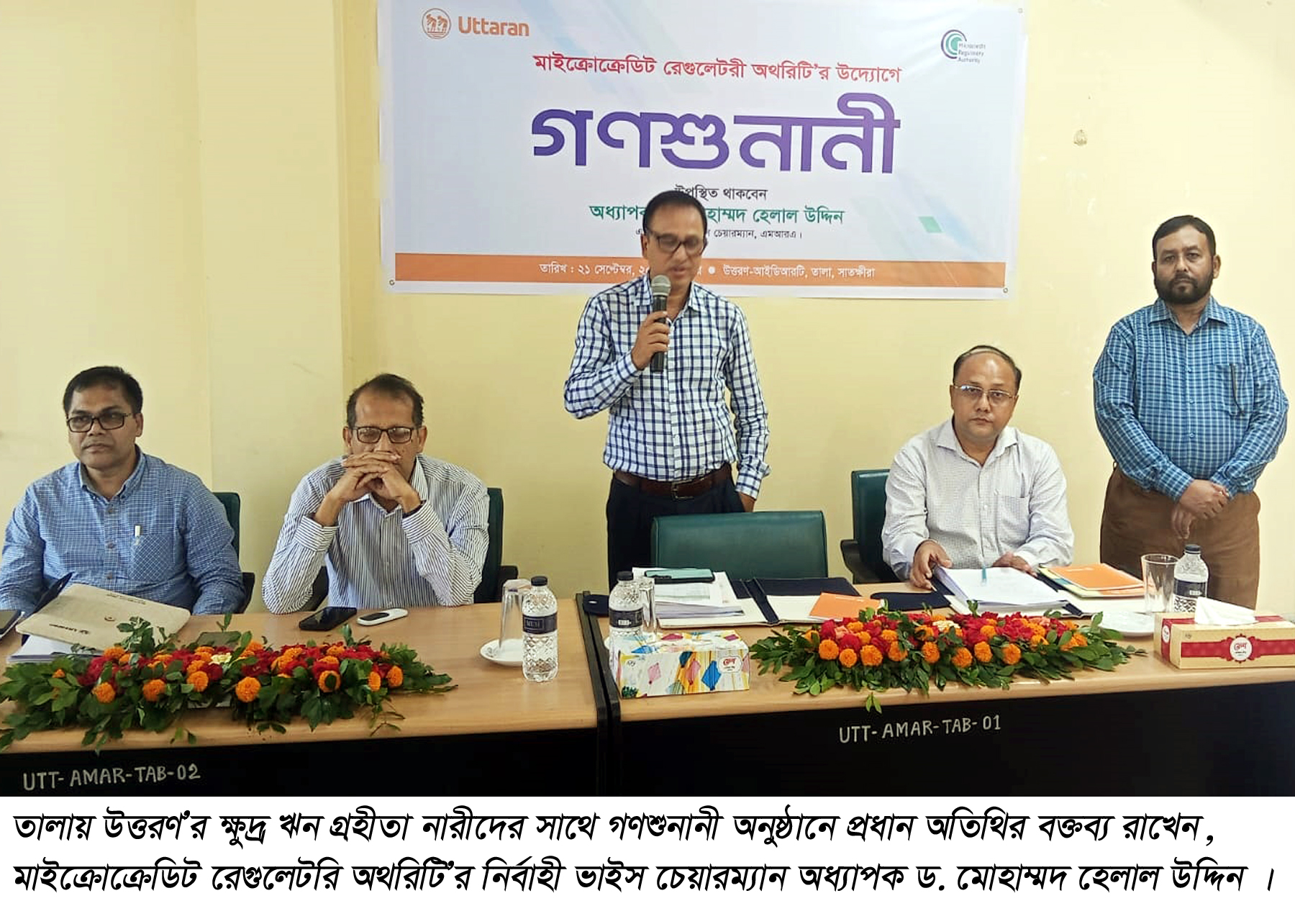 তালা প্রতিনিধি: তালায় উত্তরণের ক্ষুদ্র ঋনের উপকারভোগী নারীদের সাথে মাইক্রোক্রেডিট রেগুলেটরি অথরিটি’র (এমআরএ) এক্সিকিউটিভ ভাইস চেয়ারম্যান ও ঢাকা বিশ^বিদ্যালয়ের অর্থনীতি বিভাগের অধ্যাপক ড. মোহাম্মদ হেলাল উদ্দিন গণশুনানী করেছেন। মাইক্রোক্রেডিট রেগুলেটরি অথরিটির উদ্যোগে রোববার (২১ সেপ্টেম্বর) সকালে উত্তরণ প্রশিক্ষন সেন্টারে এই গণশুনানীর আয়োজন করা হয়। উত্তরণ পরিচালক শহিদুল ইসলাম’র সভাপতিত্বে শুনানীতে প্রধান অতিথি হিসেবে উপস্থিত থেকে ঋন গ্রহীতা নারীদের সাফল্য, সম্ভাবনা ও প্রস্তাবনা শোনেন।