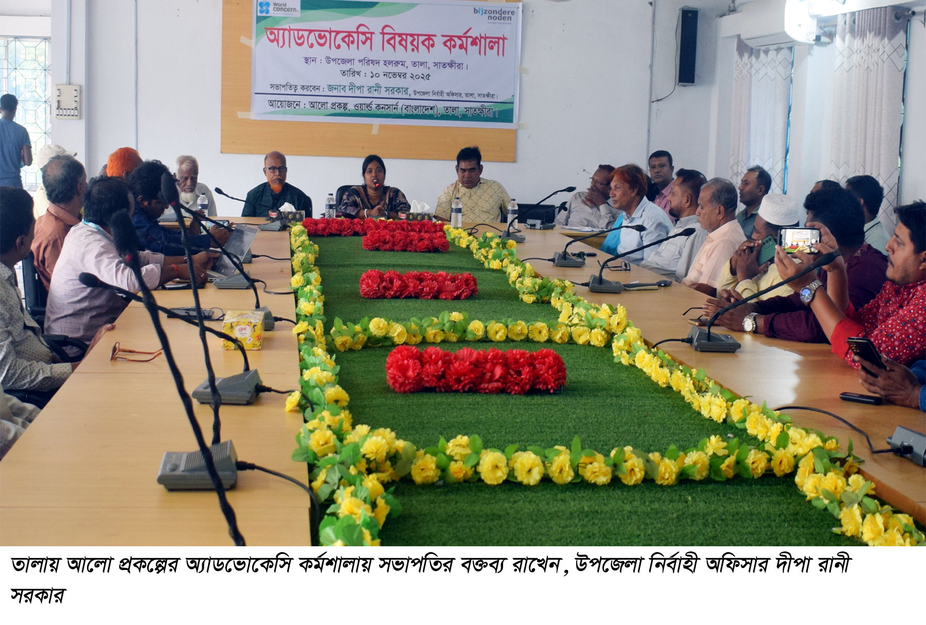 এক্সিলারেটিং লাইভলিহুড অপরচুনিটিস টু বিল্ড রেজিলেন্ট কমিউনিটিস (আলো) প্রকল্পের প্রজেক্ট অফিসার রনজিত দাশের সঞ্চালনায় সভায় বক্তব্য রাখেন ইসলামকাটি ইউনিয়ন পরিষদ চেয়ারম্যান অধ্যাপক গোলাম ফারুক, তালা সদর ইউপি চেয়ারম্যান আব্দুর রাজ্জাক, উপজেলা প্রকল্প বাস্তবায়ন কর্মকর্তা মো. আশরাফ হোসেন, পানি কমিটির নেতা অধ্যাপক রেজাউল করিম, ভূমিজ ফাউন্ডেশনের নির্বাহী পরিচালক অচিন্ত্য সাহা, উইমেন জব ক্রিয়েশন সেন্টারের নির্বাহী পরিচালক আশরাফুজ্জামান আশা, রুপালী পরিচালক শফিকুল ইসলাম, তালা প্রেস ক্লাব সভাপতি এম.এ হাকিম, সাধারন সম্পাদক ফারুক জোয়াদ্দার, জাতীয়তাবাদী ছাত্রদলের কেন্দ্রীয নির্বাহী কমিটির সাবেক সহ-সম্পাদক মারুফ-উল-ইসলাম, যুগের যাত্রী পরিচালক ইমদাদুল ইসলাম, তালা রিপোর্টার্স ক্লাবের সাবেক সাধারন সম্পাদক জুলফিকার রায়হান, প্রভাষক রবিউল আওয়াল, পানি কমিটির সাধারন সম্পাদক মীর জিল্লুর রহমান, সদস্য গাজী শহিদুল ইসলাম, শেখ জিল্লুর রহমান, ইউপি সদস্য ফেরদৌস মোড়ল, উন্নয়ন প্রচেষ্টা’র প্রতিনিধি সাংবাদিক নাহিদ হাসান বাবু, মুস্তাফিজুর রহমান রেন্টু, মিজানুর রহমান, অ্যাওসেড’র প্রতিনিধি চায়না দাস ও আলো প্রকল্পের প্রজেক্ট ম্যানেজার প্রদোষ মানকিন প্রমুখ। সভায়-তালা উপজেলাকে জলাবদ্ধমুক্ত রাখার জন্য বিভিন্ন খাল-নালা সংস্কার, স্লুইস গেট নির্মান ও গেটের সংলগ্ন খাল পলী মুক্ত রাখাসহ একটি নেটওয়ার্ক গঠনের উপর আলোচনা হয়।