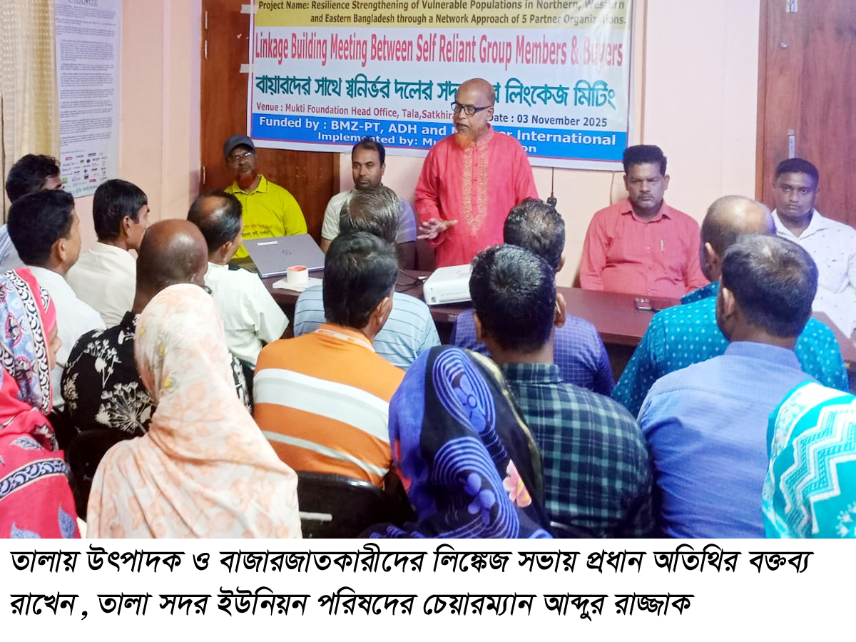 লিঙ্কেজ সভায় অন্যান্যের মধ্যে মুক্তি ফাউন্ডেশনের প্রকল্প কর্মকর্তা উত্তম কুমার ঘোষ, রাজিব কুমার দাশ, মাসুদুর রহমান, আছলিমা খাতুন, নাদিরা পারভিন, মাদুর বুননের বায়ার যথাক্রমে মনোরঞ্জন সরকার ও তারক সরকার, শপিং ব্যাগের বায়ার কামরুল ইসলাম, সরিষার তৈল, নারিকেল তৈল ও হলুদের পাইকার বিপ্লব হোসেন, ঘি ট্রেডের বায়ার জয়দেব ঘোষ, উপকারভোগীদের মধ্যে আবু বকর মোড়ল, দিপঙ্কর দাশ, আহল্লাদ সরকার, স¦র্ণলতা বিশ্বাস, প্রতিমা মন্ডল ও সবিতা মন্ডল প্রমূখ বক্তব্য রাখেন।