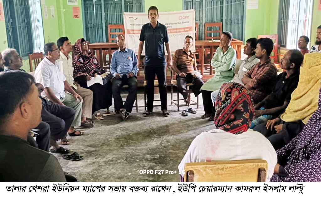 তালা প্রতিনিধি: অ্যাওসেড ও কেয়ার বাংলাদেশের যৌথ আয়োজিত, বিএমজেড অর্থায়িত ম্যাপ-সিডিআরএফআই প্রকল্পের অধীন তালা উপজেলার খেশরা ইউনিয়ন পরিষদ মিলনায়তনে ইউনিয়ন পর্যায়ের জলবায়ু দুর্যোগ ঝুঁকি অর্থায়ন ও বীমা সংক্রান্ত পরামর্শ সভা অনুষ্ঠিত হয়েছে। সভায় সভাপতিত্ব করেন, খেশরা ইউনিয়ন পরিষদের চেয়ারম্যন ও ম্যাপ এর আহবায়ক মো. কামরুল ইসলাম লাল্টু। সভার সঞ্চালনায় ছিলেন অ্যাওসেডের ম্যাপ সিডিআরএফআই প্রকল্পের ফিল্ড অফিসার চায়না রানী দাশ। এসময় তিনি আমাদের জল, জীবন ও ভবিষ্যৎ বিষয়ক ধারণাপত্র উপস্থাপন করেন।