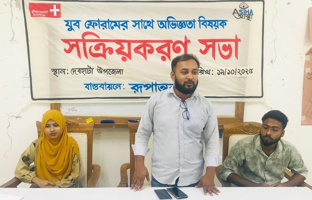 দেবহাটা প্রতিনিধি: দেবহাটা উপজেলা যুব ফোরামের সক্রিয়করণ সভা অনুষ্ঠিত হয়েছে। রবিবার (১৯ অক্টোবর) বেসরকারি উন্নয়ন সংস্থা রূপান্তরের আয়োজনে আস্থা প্রকল্পের আওতায় উপজেলা মডেল মসজিদ মিলনায়তনে এ সক্রিয়করণ সভা অনুষ্ঠিত হয়। অনুষ্ঠিত সভায় সভাপতিত্ব করেন উপজেলা যুব ফোরামের সদস্য রিফায়েত হোসেন। এতে প্রধান অতিথি হিসেবে উপস্থিত ছিলেন জেলা নাগরিক প্লাটফর্মের সদস্য ও দেবহাটা উপজেলা প্রেসক্লাবের সভাপতি মীর খায়রুল আলম। প্রকল্পের ফিল্ড অফিসার বিপুল রায় এর সঞ্চালনায় সভায় মূল বিষয়বস্তু উপস্থাপন করেন প্রকল্পের জেলা সমন্বয়কারী মাসুদ রানা। সভায় মাঠ পর্যায়ের কার্যক্রম বিষয়ে বিস্তারিত আলোচনা ও অগ্রীম পরিকল্পনা গ্রহণ করা হয়। অংশগ্রহণকারী হিসেবে উপজেলার ৫টি ইউনিয়নের যুব সদস্যরা উপস্থিত ছিলেন।