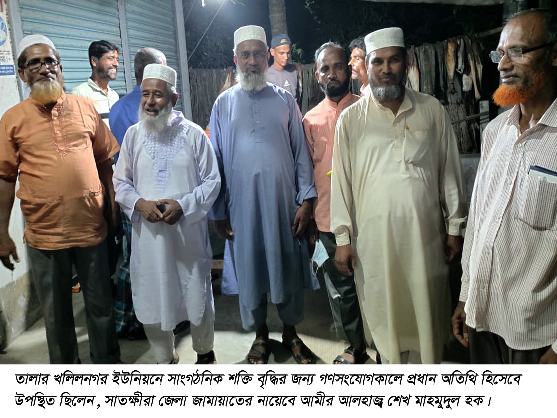 তালা প্রতিনিধি: সাংগঠনিক কর্মকান্ড বৃদ্ধির লক্ষ্যে তালা উপজেলার খলিলনগর ইউনিয়নে জামায়াত ইসলামীর গণসংযোগ অনুষ্ঠিত হয়েছে। ২০ এপ্রিল সন্ধ্যায় উপজেলার খলিলনগর ইউনিয়নের মহান্দী ও নুরুল্লাপুর এলাকায় দলের পক্ষ থেকে গণসংযোগ চালানো হয়। গণসংযোগে প্রধান অতিথি হিসেবে উপস্থিত ছিলেন সাতক্ষীরা জেলা জামায়াতের নায়েবে আমির আলহাজ্ব ডাক্তার মাহমুদুল হক। বিশেষ অতিথি হিসেবে উপস্থিত ছিলেন, তালা উপজেলা ওলামা বিভাগের সভাপতি মাওলানা কবিরুল ইসলাম, ১২ নম্বর খলিলনগর ইউনিয়ন জামায়াতের আমীর মাওলানা আকবর হোসাইন, সেক্রেটারি মাষ্টার মহিউদ্দিন ও শ্রমিক কল্যাণ ফেডারেশনের ইউনিয়ন সভাপতি আলমগীর হোসাইন প্রমুখ।