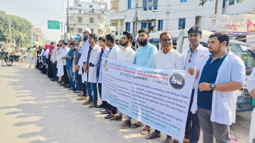 সাতক্ষীরায় মেডিকেল টেকনোলজিস্ট ও ফার্মাসিস্টদের ৬ দফা দাবিতে মানববন্ধন